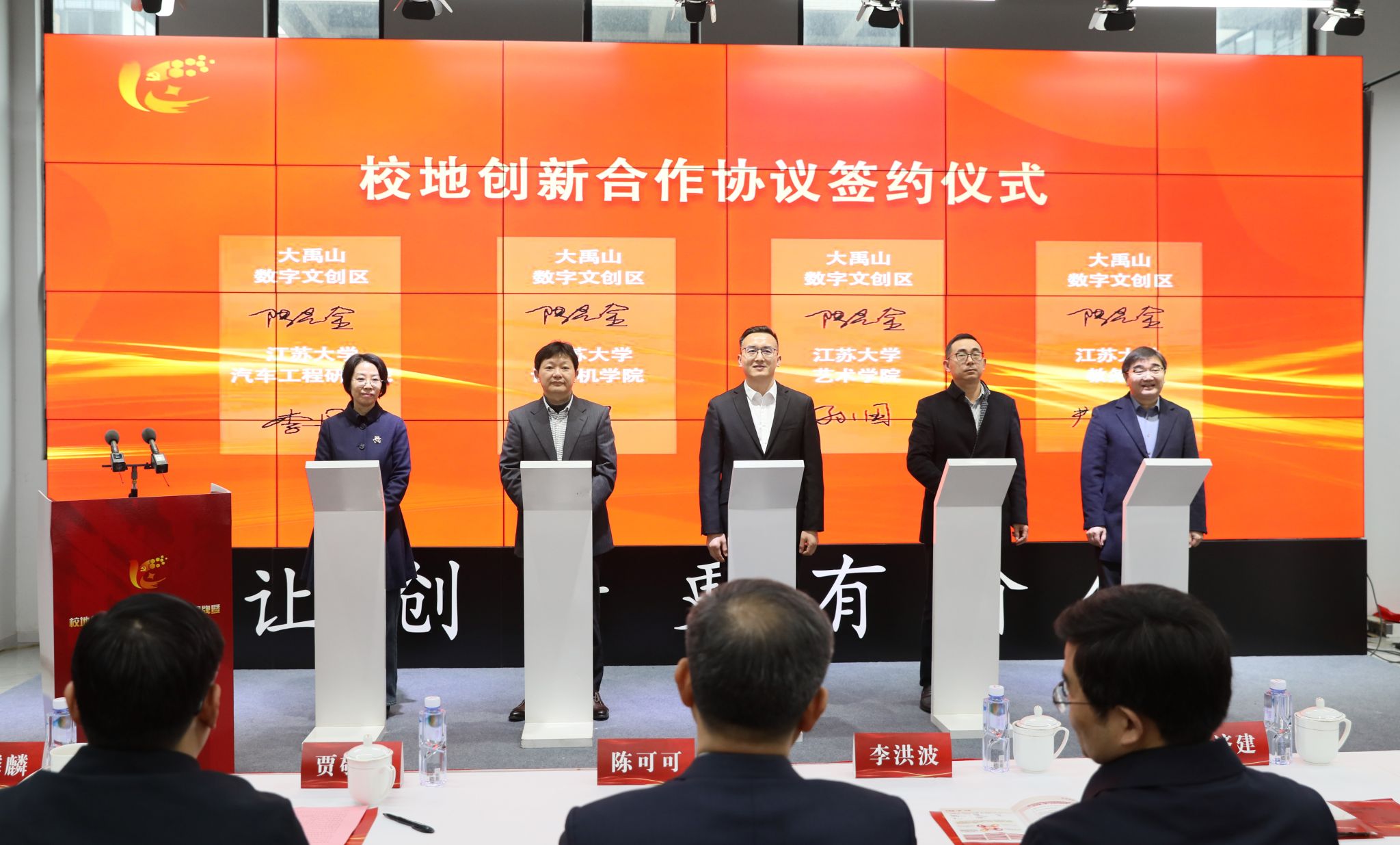 教務(wù)處、藝術(shù)學(xué)院、計(jì)算機(jī)學(xué)院、汽車工程研究院與大禹山數(shù)字文創(chuàng)區(qū)簽訂校地創(chuàng)新合作協(xié)議,學(xué)校10名統(tǒng)戰(zhàn)成員負(fù)責(zé)的項(xiàng)目簽約入駐京鷗新“智”空間。