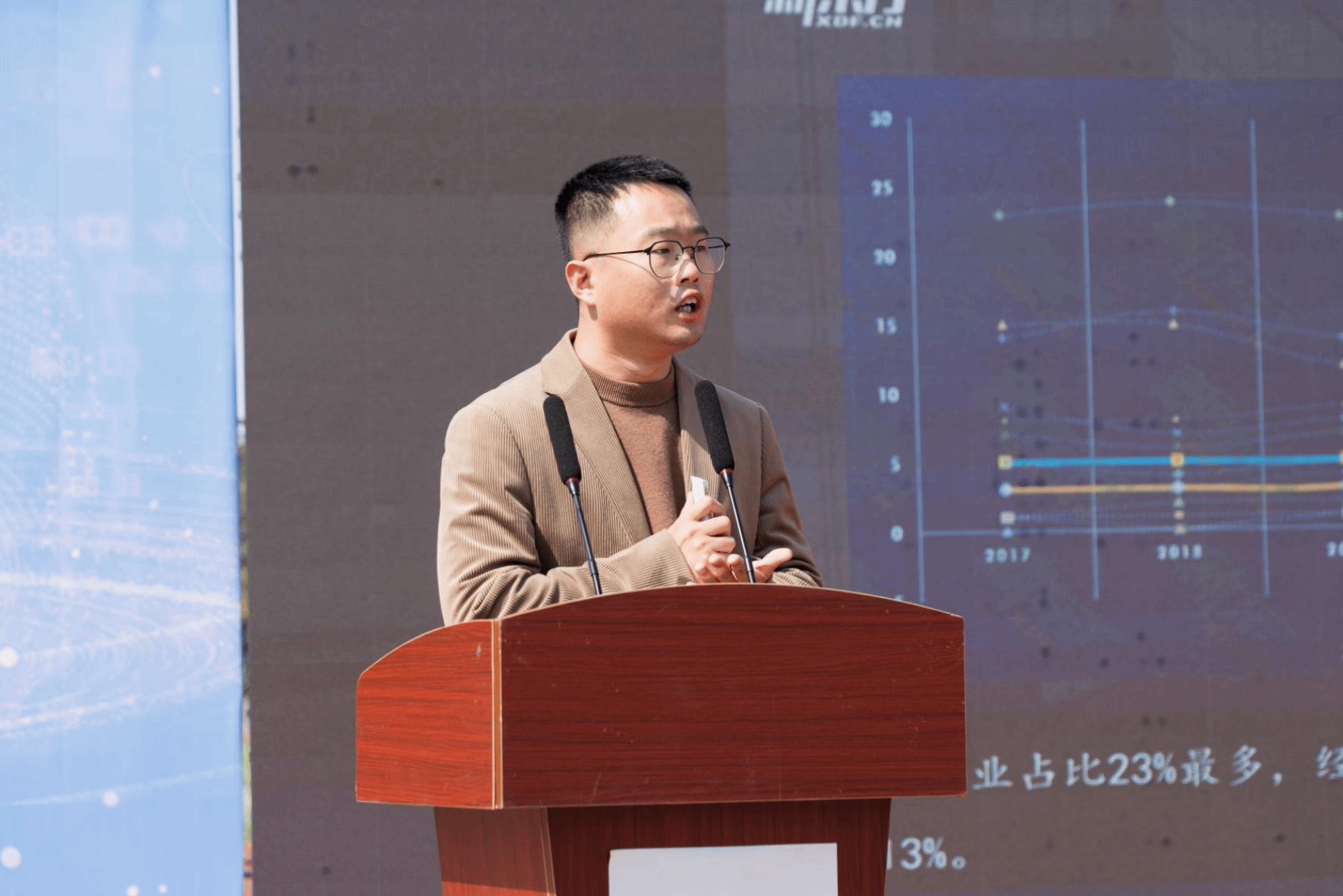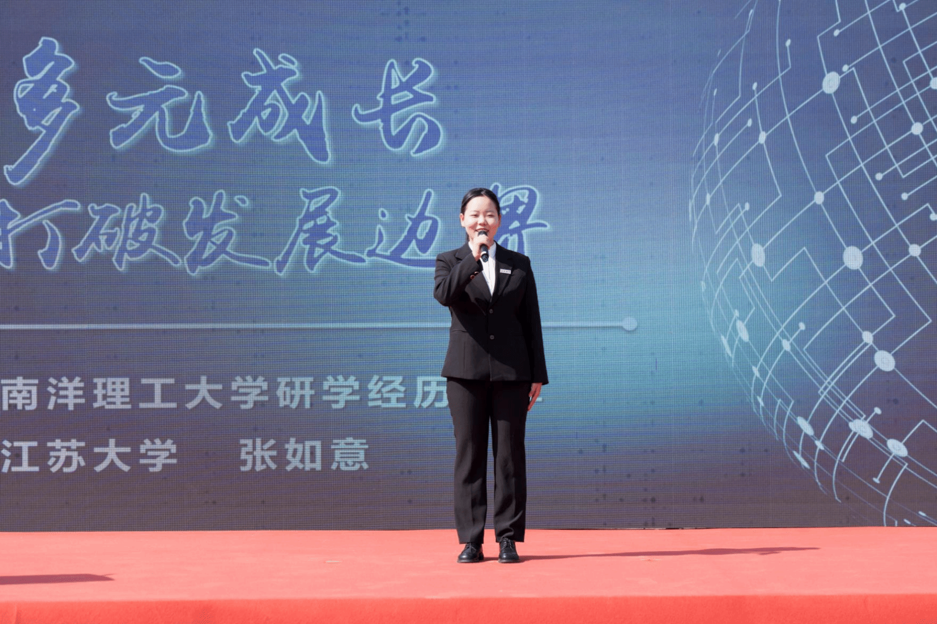 在海外學習成果交流環節,新東方國際教育事業部作留學大數據解析,學工處、國際處聯合發布江蘇大學海外學習成果數據報告,海外項目優秀學子張如意分享學習心得與感悟。