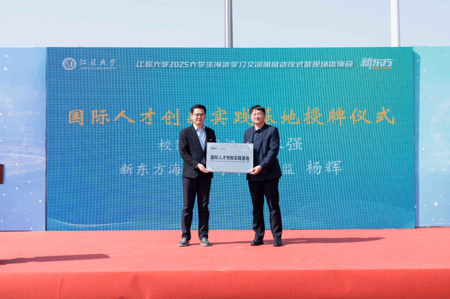 校團委書記張永強代表學校向新東方海外留學部楊輝授牌建立國際人才創新實踐基地。