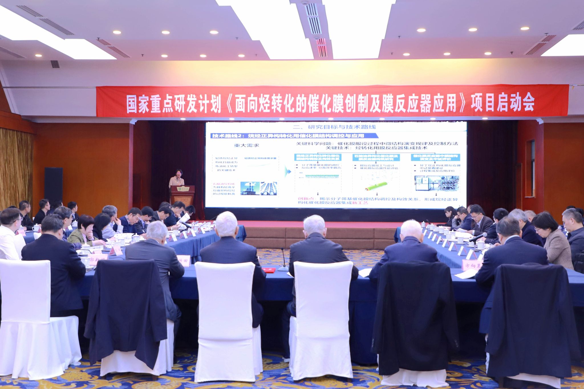 項(xiàng)目專家組中國石化集團(tuán)公司曹湘洪院士、浙江工業(yè)大學(xué)高從堦院士、中石化大連石油化工研究院胡永康院士、中石化石油化工科學(xué)研究院舒興田院士、中國化工學(xué)會秘書長方向晨教授級高工、大連理工大學(xué)郭新聞教授、湘潭大學(xué)羅和安教授等20余位專家學(xué)者出席會議。項(xiàng)目負(fù)責(zé)人邢衛(wèi)紅,項(xiàng)目承擔(dān)單位人員、江蘇大學(xué)副校長李紅、科技處處長魯金忠,課題承擔(dān)單位人員、中石化石油化工科學(xué)研究院有限公司黨委副書記田樹新高級工程師、南京工業(yè)大學(xué)副校長顧學(xué)紅及骨干成員等50余人參加會議。