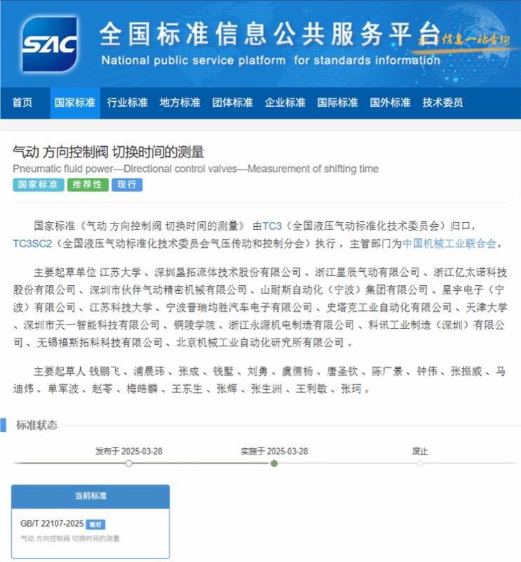 該標準規定了電控和氣控方向控制閥切換時間的測試方法,涵蓋適用范圍、規范性引用文件、術語定義、測試設備、測試精度、測試程序、數據計算及測試數據報告等核心內容,適用于具有2個或3個工作位置的單穩態和雙穩態氣動方向控制閥。該標準的發布實施為氣動方向控制閥切換時間的測量提供了統一的技術規范,有助于企業優化生產工藝、提升產品質量控制水平,推動我國氣動元件制造向高端化、智能化方向發展。