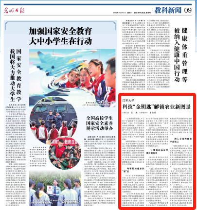 光明日報9版、中國教育報4版、江蘇教育報2版以“科技‘金鑰匙’解鎖農(nóng)業(yè)‘新圖景’”為主題,報道了學校積極謀劃發(fā)展農(nóng)業(yè)新質(zhì)生產(chǎn)力的要素集聚,加快農(nóng)業(yè)關鍵核心技術攻關和成果轉(zhuǎn)化,有組織推進人才培養(yǎng)、科技創(chuàng)新和社會服務的生動實踐。