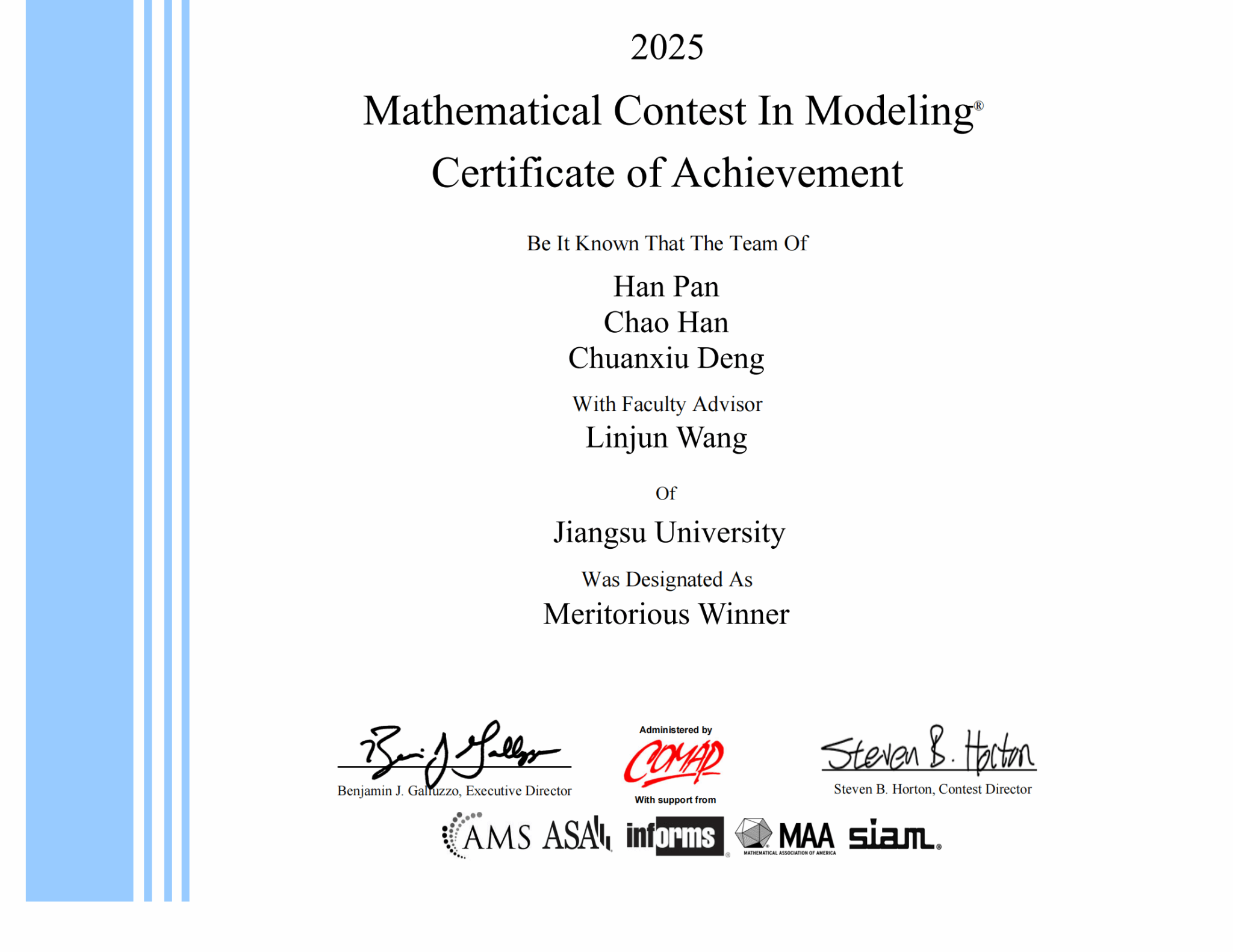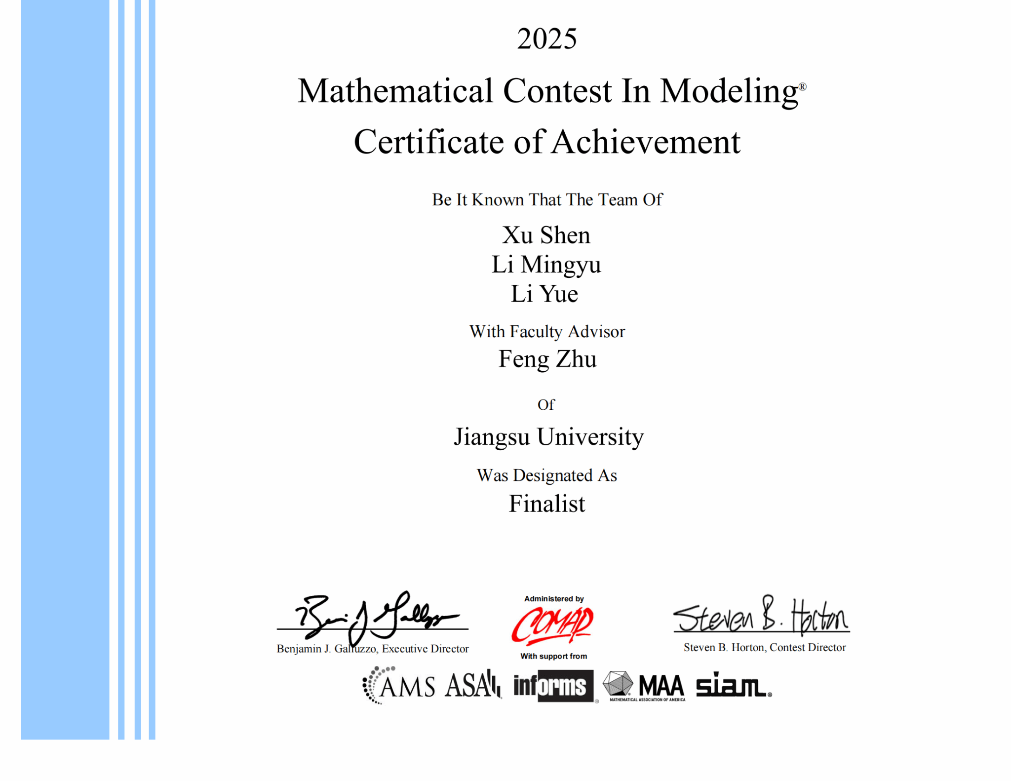 近日,2025年美國大學生數學建模競賽成績揭曉,夢溪學院學生獲得特等獎提名獎(F獎)一項、一等獎(M獎)一項、二等獎(H獎)一項、三等獎(S獎)兩項。