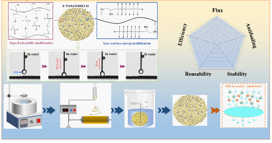 該論文聚焦乳液分離過程中膜污染問題,創新性提出一種內外雙修策略構筑一種雙重抗污屬性的功能化聚丙烯腈(PAN)纖維膜。內部改性通過在PAN膜的纖維網絡中接枝兩性離子聚合物,強化膜基質的水合能力,形成穩定的水合層和平衡膜表面電荷以抵抗油污染物的表面吸附,形成“污染物抵抗”功能;外部改性通過構建低表面能微區域,降低油污染物的水下粘附,賦予膜材料“污染物釋放”特性,雙重抗污屬性協同作用強化膜材料的抗污能力。所制備的膜展現出優異的超親水-水下超低油粘附的潤濕特性,雙重抗污特性進一步強化膜材料的抗污能力,顯著提升膜材料的乳液分離效果(分離通量超過2000L·m?2·h?1,分離效率高達99.1%)。