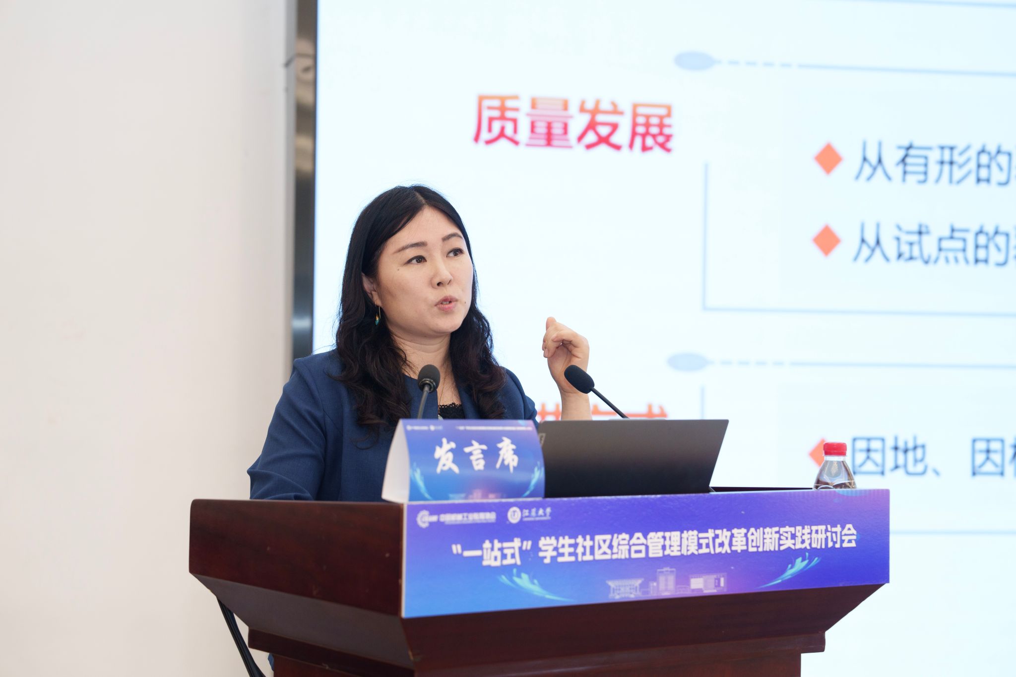 開幕式后,5位知名專家學者圍繞“一站式”學生社區綜合管理模式改革創新分別作主題報告,為推進“一站式”學生社區建設提供了寶貴參考。王慧敏系統闡述了全國高校思想政治工作網工作開展情況和數智賦能學生社區管理的創新應用與實踐路徑。蘇州大學黨委學生工作部部長董召勤立足高校“一站式”學生社區建設實踐,針對共性難題提出了具有可操作性的解決方案。南京大學黨委學生工作部副部長李興華分享了“五個一”建設模式下構建師生成長共同體的創新經驗。江蘇大學黨委學生工作部部長任澤中解讀了“主治·共治·自治·智治”學生社區治理新模式的實踐探索。金智教育研究院學生管理與服務中心主任譚利娟從社區育人視角,分享了高校數據應用建設的典型案例。