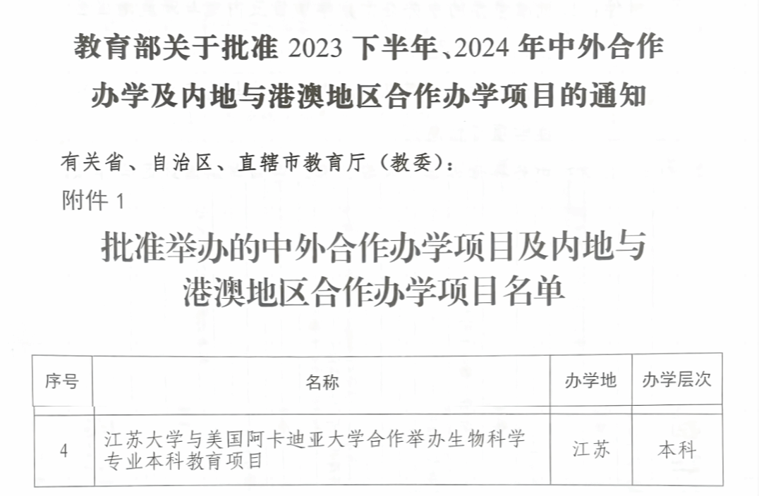 5月9日,教育部公布2025年經(jīng)審核的中外合作辦學(xué)機構(gòu)和項目名單。江蘇大學(xué)與美國阿卡迪亞大學(xué)合作舉辦的生物科學(xué)專業(yè)本科教育項目正式獲批,這是我校在中外合作辦學(xué)領(lǐng)域取得的又一重要突破。