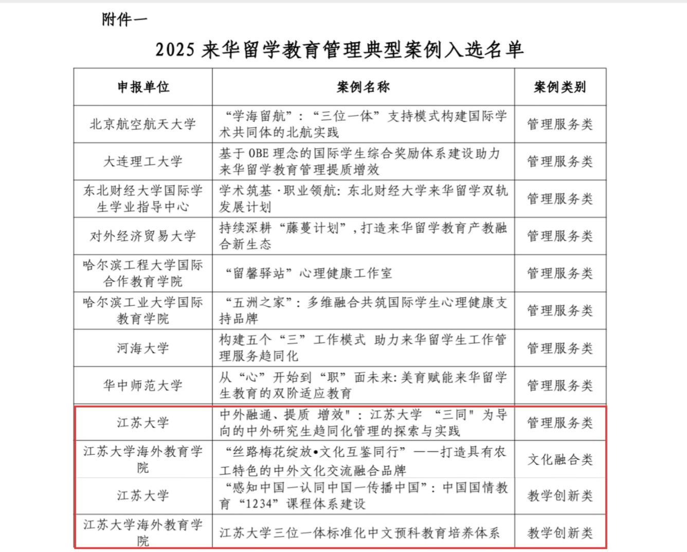 近日,中國高等教育學會外國留學生教育管理分會公布了2025年“學在中國”來華留學教育管理典型案例入選名單。我校4項案例入選,入選總數在江蘇省高校中位居首位。