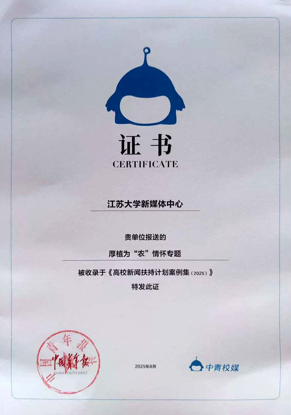 近日,由中國青年報社主辦的“青春為中國式現代化挺膺擔當”科技賦能高校融媒體育人實效研討會召開。會上公布了年度高校新聞扶持計劃案例,江蘇大學新媒體中心報送的《厚植為“農”情懷》獲評年度高校融合創新新聞專題作品,成果收錄于《高校新聞扶持計劃案例集(2025)》,江蘇大學官方微信被收錄于《2024-2025高校官微案例集》。