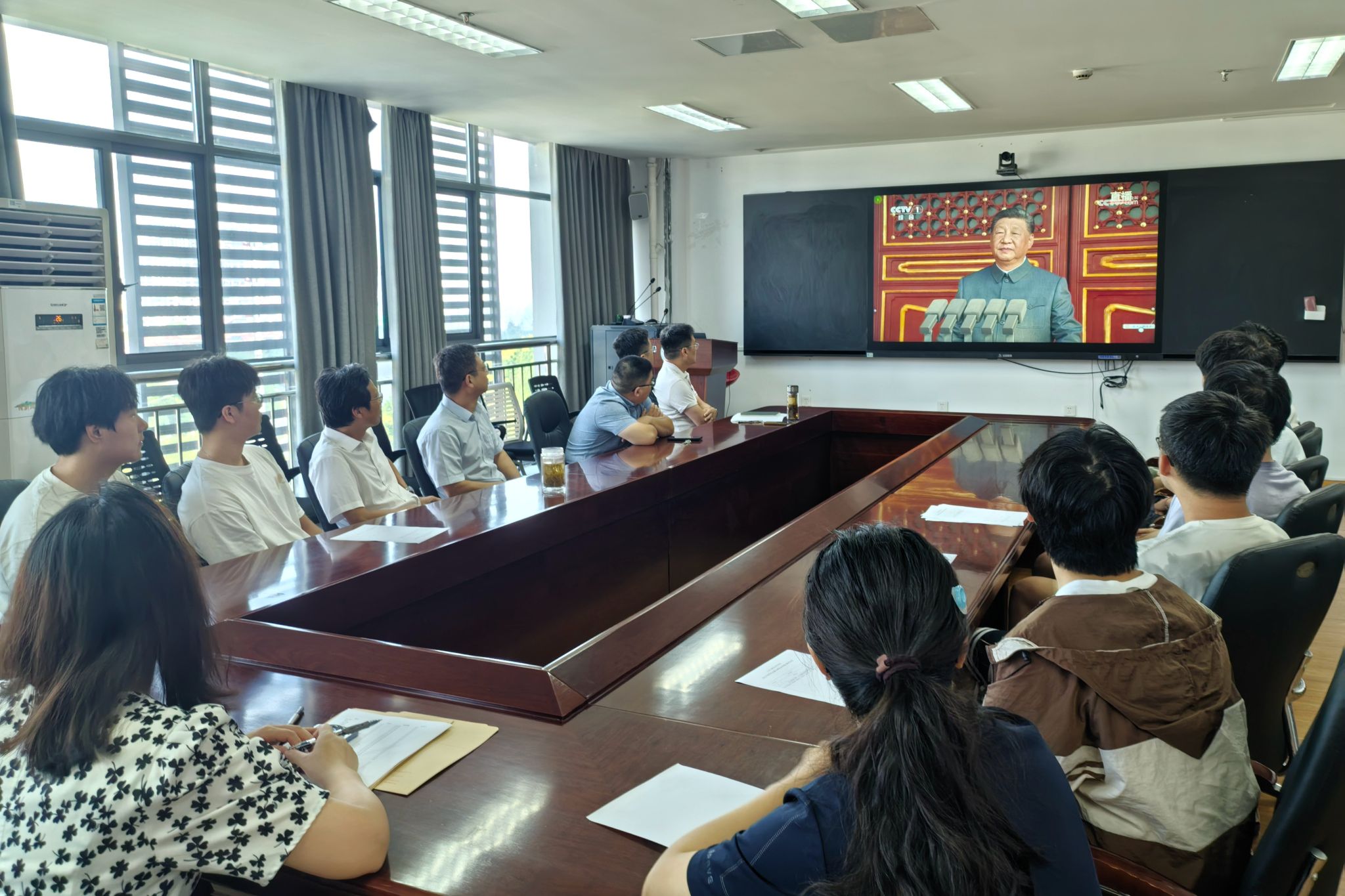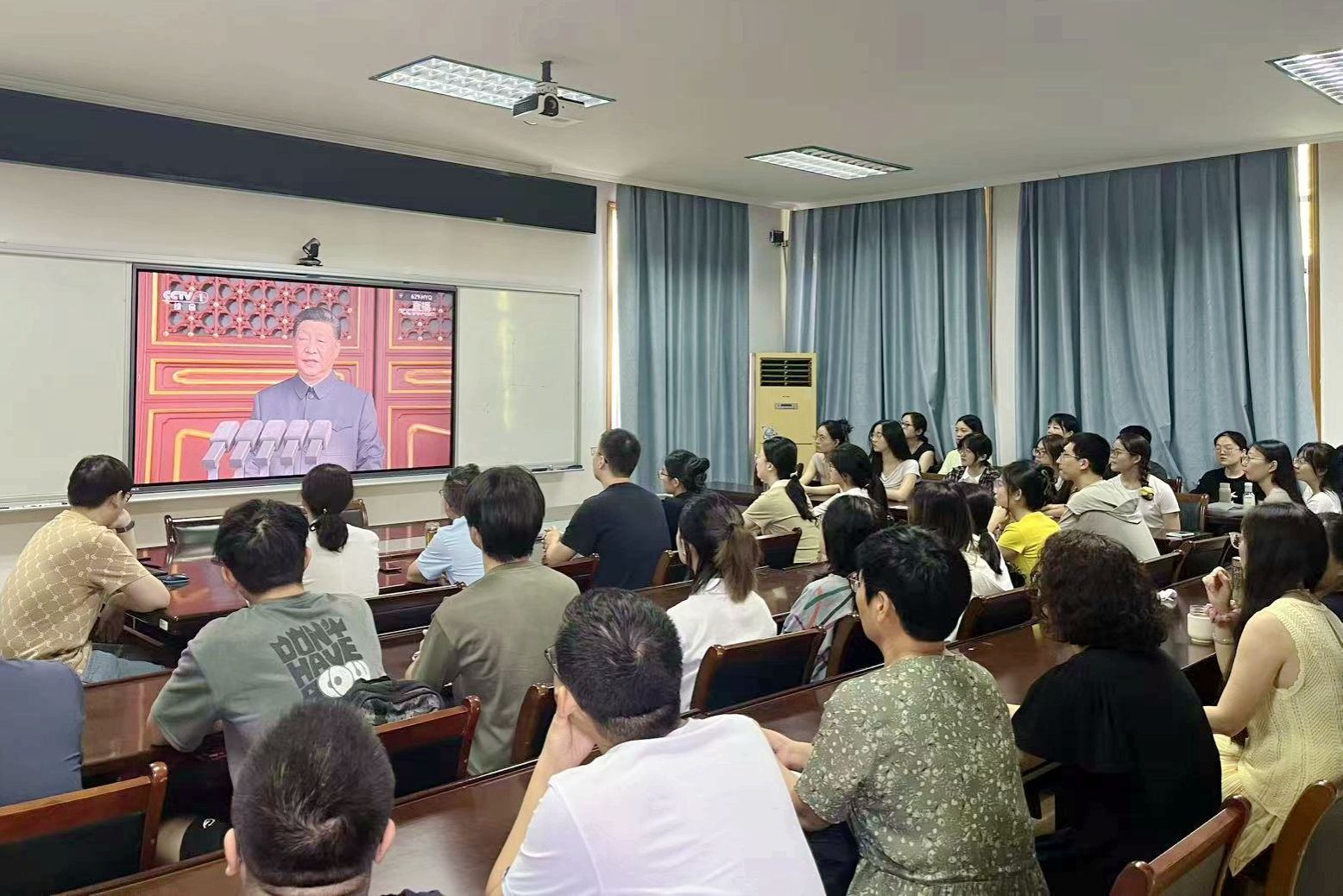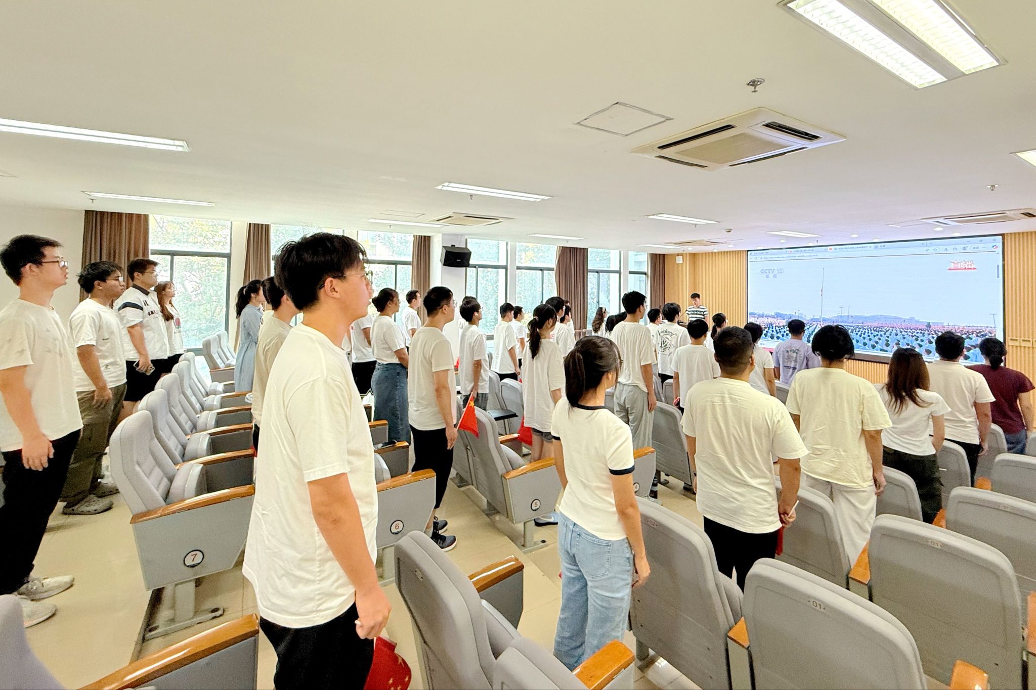 上午9時,大會正式開始。隨著莊嚴的國歌聲響起,主會場內師生全體起立,齊唱國歌。在聆聽習近平總書記重要講話時,現場師生神情肅穆,認真記錄;當受閱方(梯)隊經過天安門廣場時,收看現場不時響起熱烈掌聲。