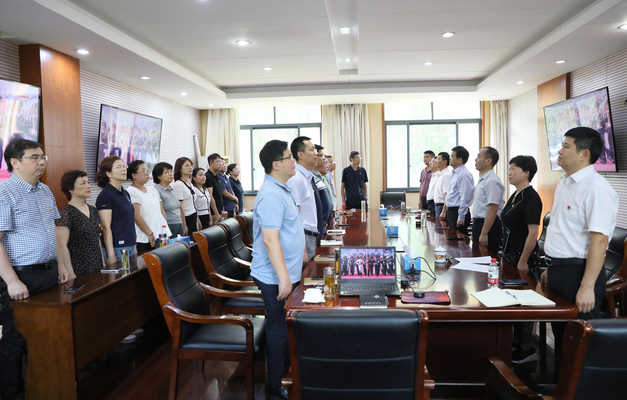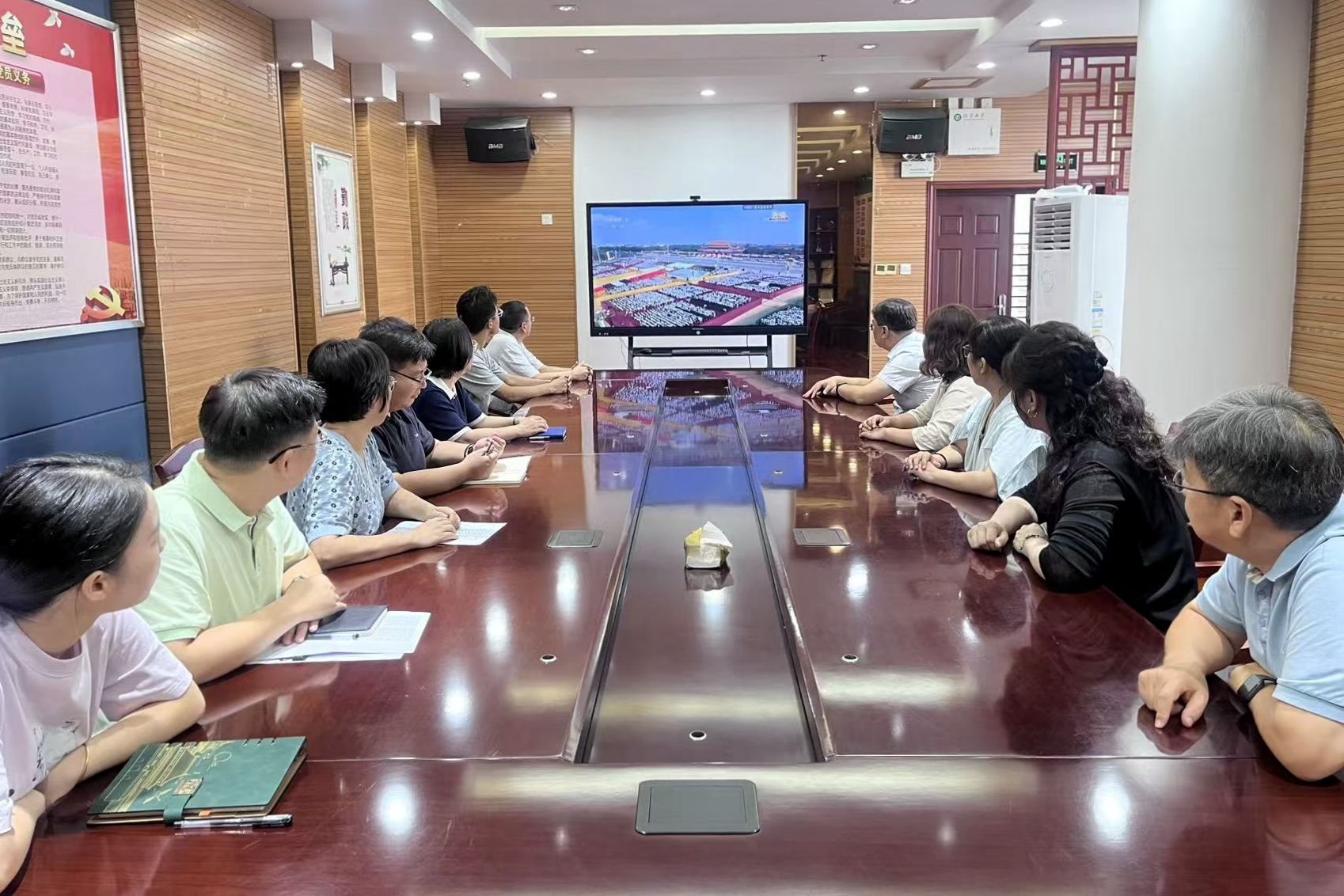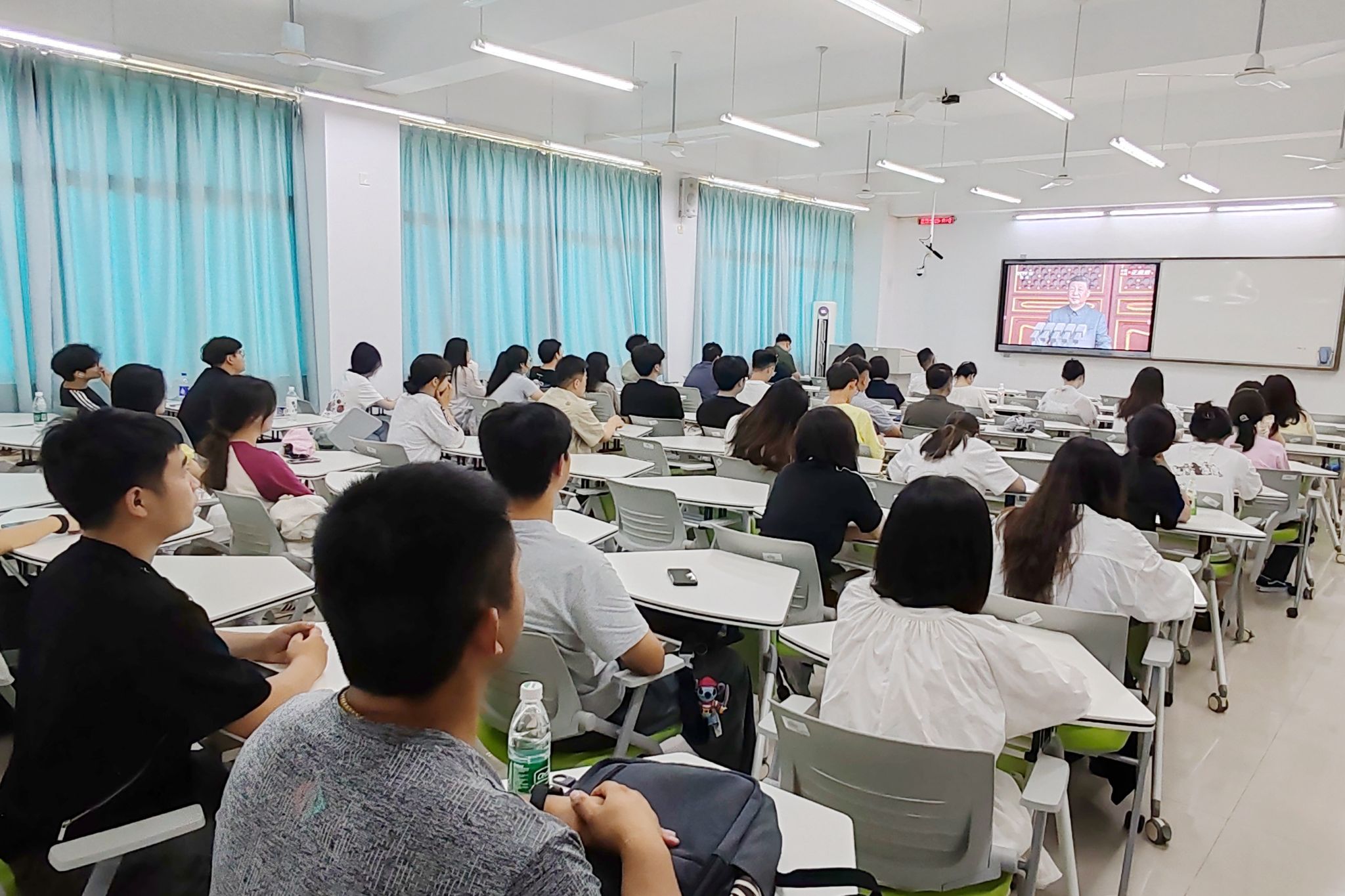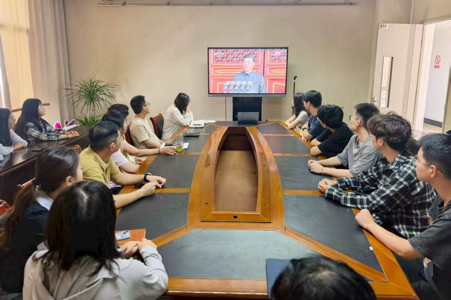 上午9時,大會正式開始。隨著莊嚴的國歌聲響起,主會場內師生全體起立,齊唱國歌。在聆聽習近平總書記重要講話時,現場師生神情肅穆,認真記錄;當受閱方(梯)隊經過天安門廣場時,收看現場不時響起熱烈掌聲。
