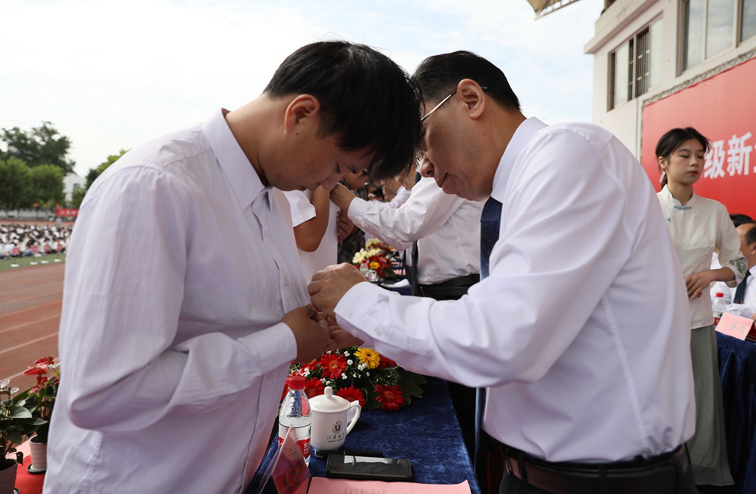 典禮上舉行了校徽佩戴儀式,校領(lǐng)導(dǎo)為新生代表佩戴校徽,在場的全體新生佩戴了校徽。