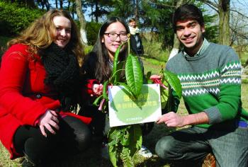 3月10日,江蘇大學開展“中外學子共植友誼樹”活動,來自法國、波蘭、剛果、巴基斯坦等國的留學生和中國學生一起來到校園綠化帶植樹,表達共建綠色生態校園的決心,迎接植樹節的到來。圖為中外大學生在剛植的小樹上掛上護綠牌。