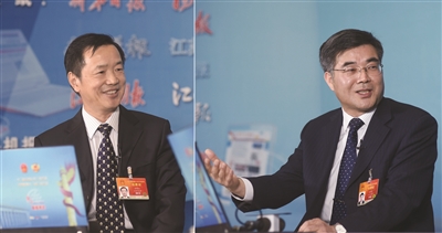 全國人大代表、江蘇大學校長袁壽其(右),中國礦業大學副校長繆協興(左)在新華報業全媒體全國兩會直播室。
